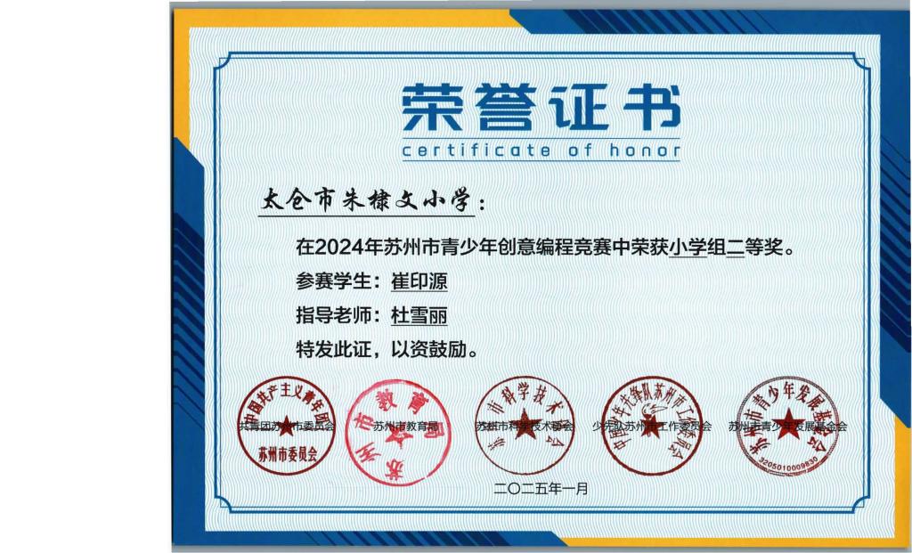太仓市朱棣文小学在2024年苏州市青少年创意编程竞赛中荣获小学组二等奖