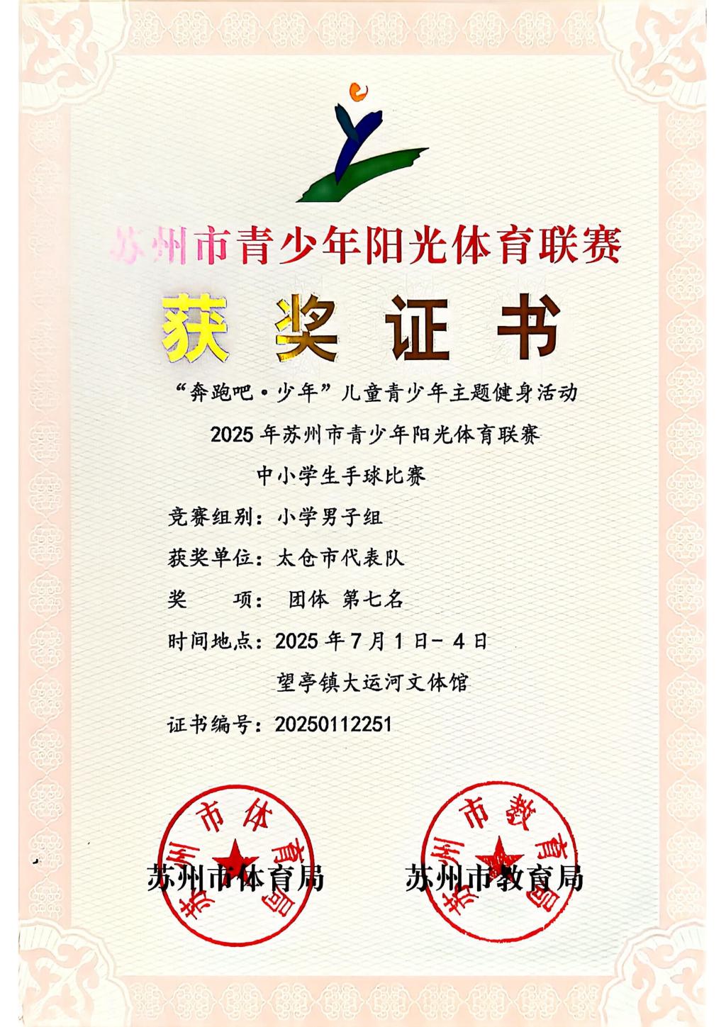 太仓市朱棣文小学在“奔跑吧·少年”儿童青少年主题健身活动2025年苏州市青少年阳光体育联赛中小学生手球比赛中获小学男子组团体第七名