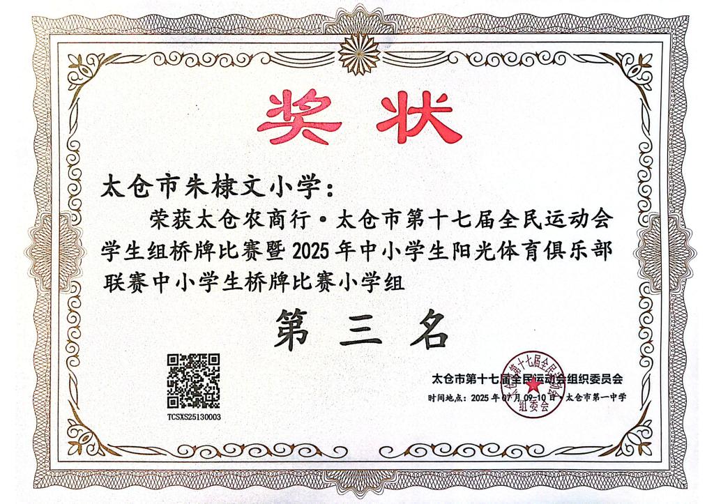 太仓市朱棣文小学荣获太仓农商行·太仓市第十七届全民运动会学生组桥牌比赛暨2025年中小学生阳光体育俱乐部联赛中小学生桥牌比赛小学组第三名