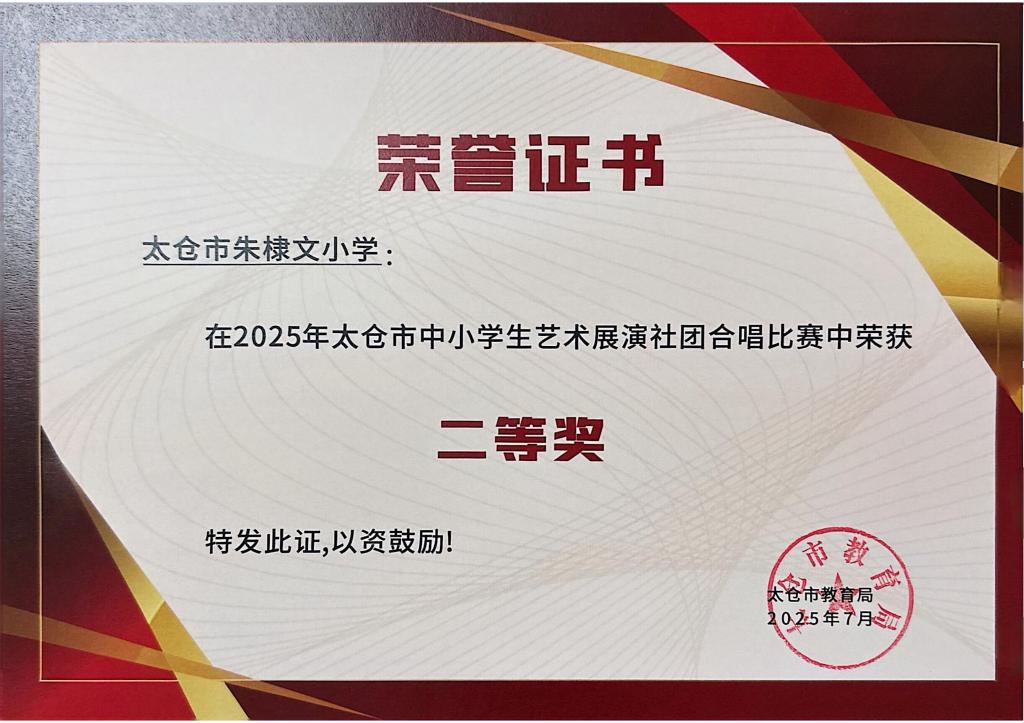 太仓市朱棣文小学在2025年太仓市中小学生艺术展演社团合唱比赛中荣获二等奖