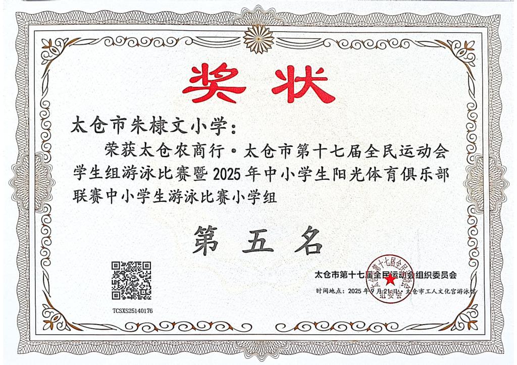 太仓市朱棣文小学在太仓农商行·太仓市第十七届全民运动会学生组游泳比赛暨2025年中小学生阳光体育俱乐部联赛小学生游泳比赛中获第五名