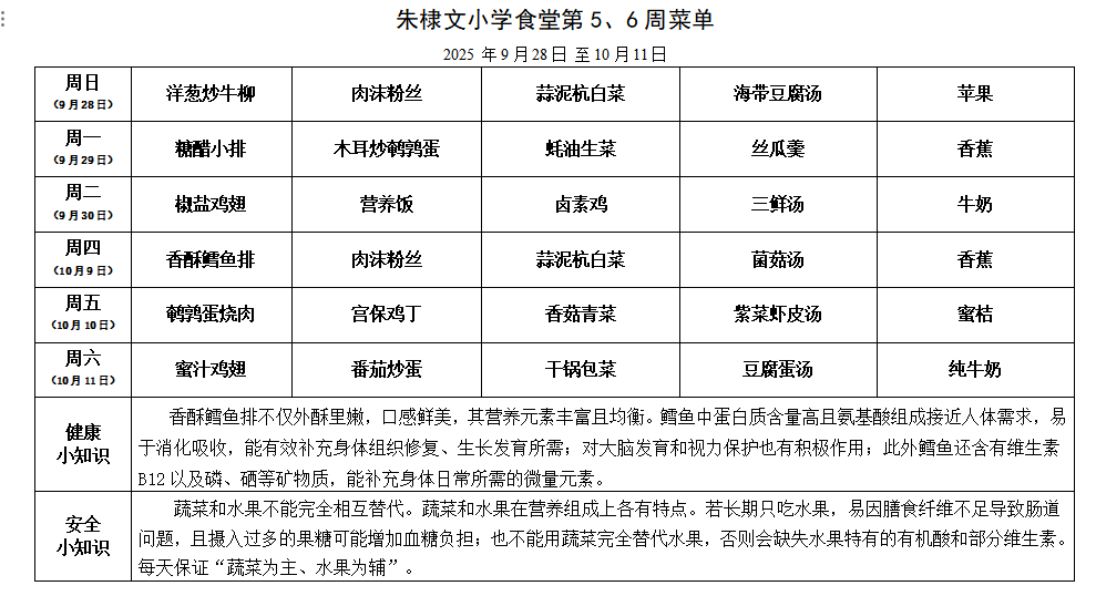 2025-2026学年第一学期朱棣文小学食堂第五、六周食谱