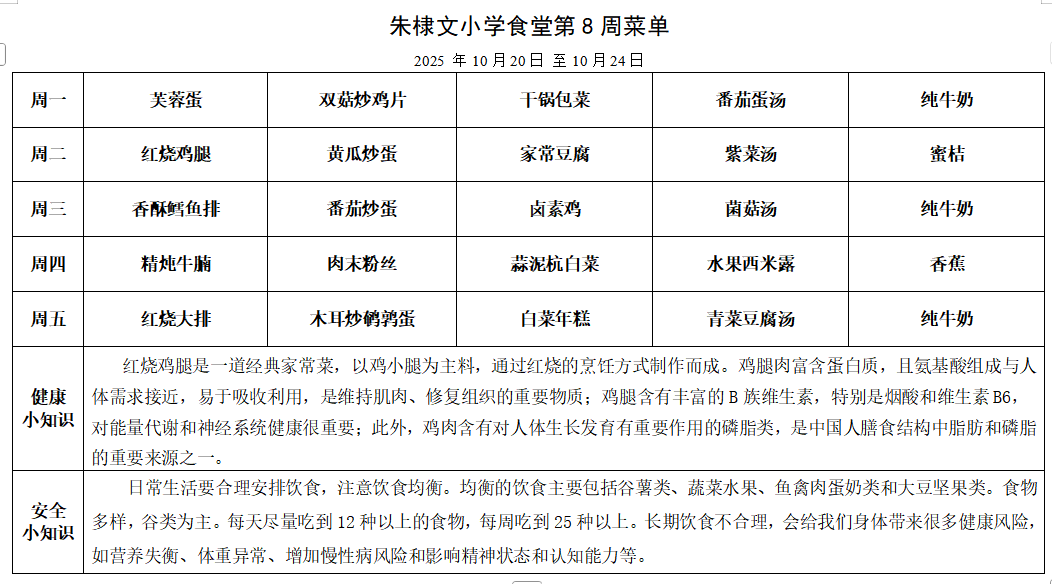 2025-2026学年第一学期朱棣文小学食堂第八周食谱