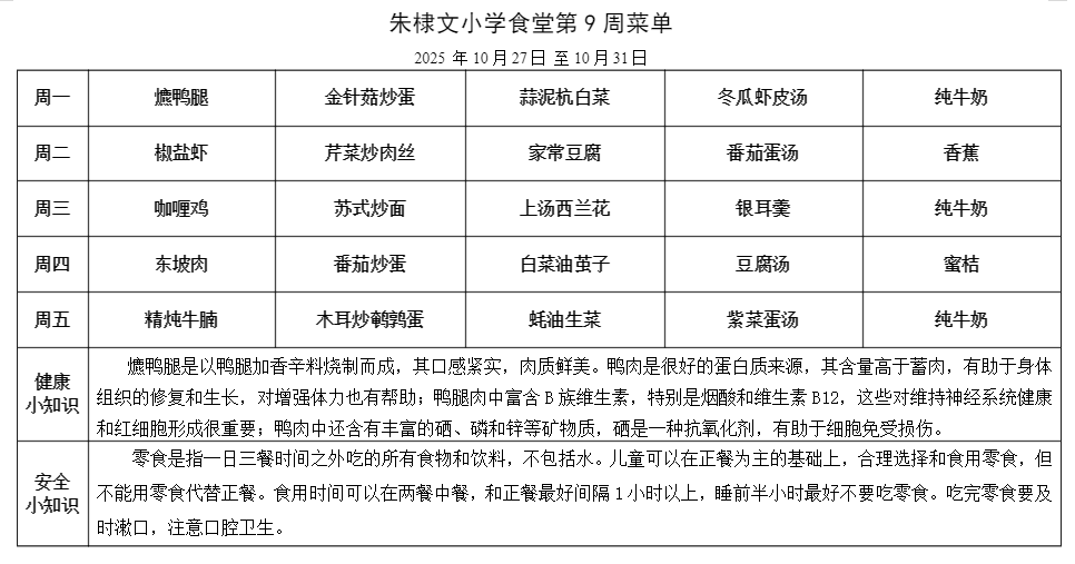 2025-2026学年第一学期朱棣文小学食堂第九周食谱