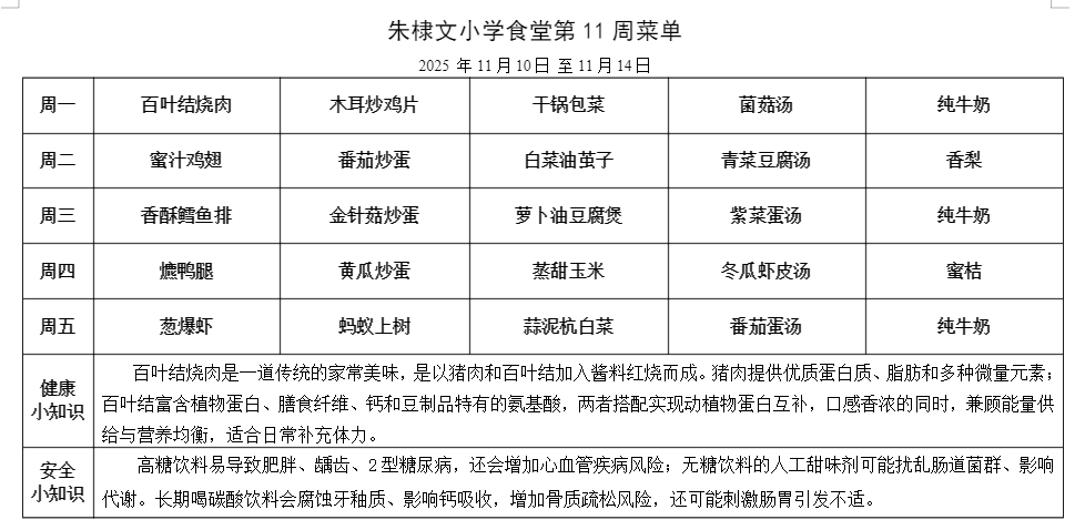 2025-2026学年第一学期朱棣文小学食堂第十一周食谱