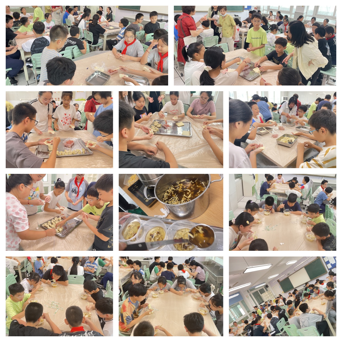 学生们围坐在一起,包馄饨的活动正如火如荼地展开,体验着动手实践与合作带来的快乐。他们或是熟练地捏出漂亮的褶皱,或是小心翼翼地包裹着馅料,每一笔一划都充满了童趣与创意。
