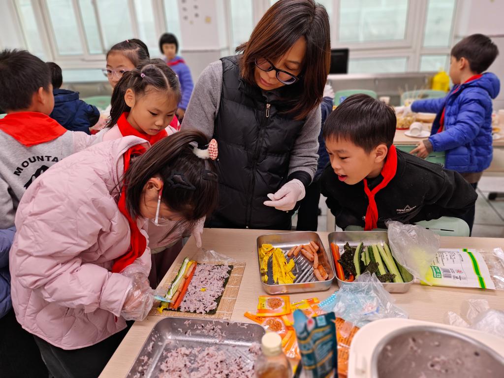活动现场,家长志愿者化身“美食导师”,耐心示范食材处理技巧:铺海苔、抹米饭、摆肉松黄瓜卷寿司,调酱汁、刷蜂蜜、控火候烤鸡翅,每一步都讲解细致。同学们听得认真、做得投入,有的小心翼翼卷寿司,有的专注给鸡翅刷酱,遇到问题及时向家长请教,现场欢声笑语不断。