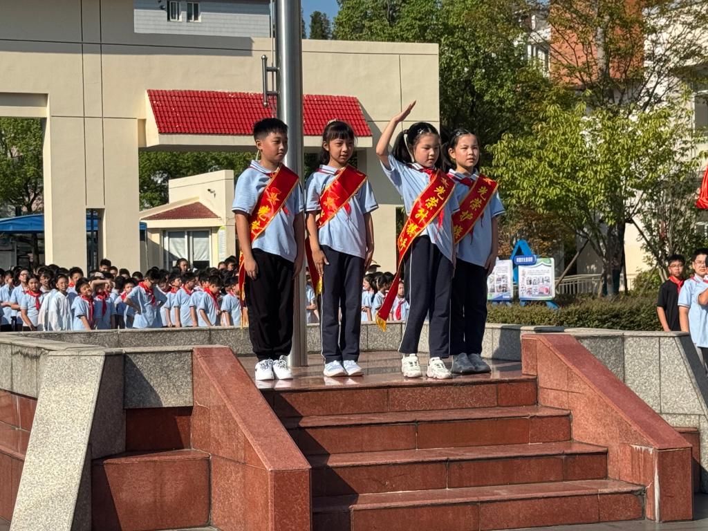 主持甲:担任本周升旗手的是顾淽菡、黄可欣,护旗手是赵允硕、黄可怡。他们文明有礼、团结同学,是我们学习的好榜样!