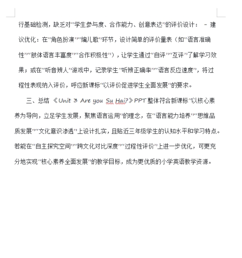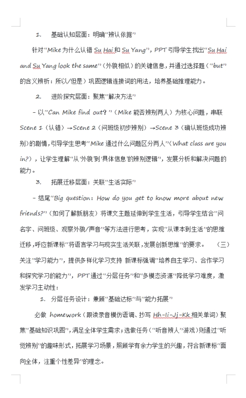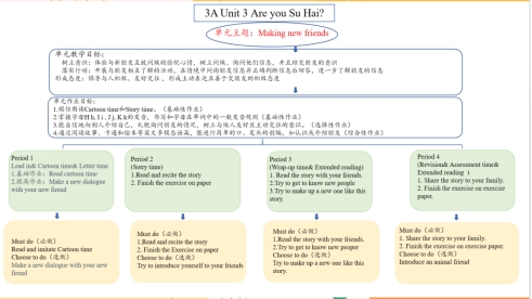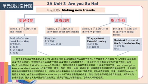 过程: 一、确定校内听课内容 课题组成员选择听取征晓老师的新译林版英语教材 3A Unit 3 Are you Su Hai?(Story time)以及说课; 二、形成单元规划设计图