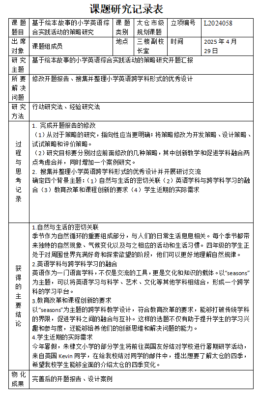 4月29日下午,《基于绘本故事的小学英语综合实践活动的策略研究》课题组开展4月专题研究活动。对开题报告进行优化调整,并开展优秀课例研讨交流。