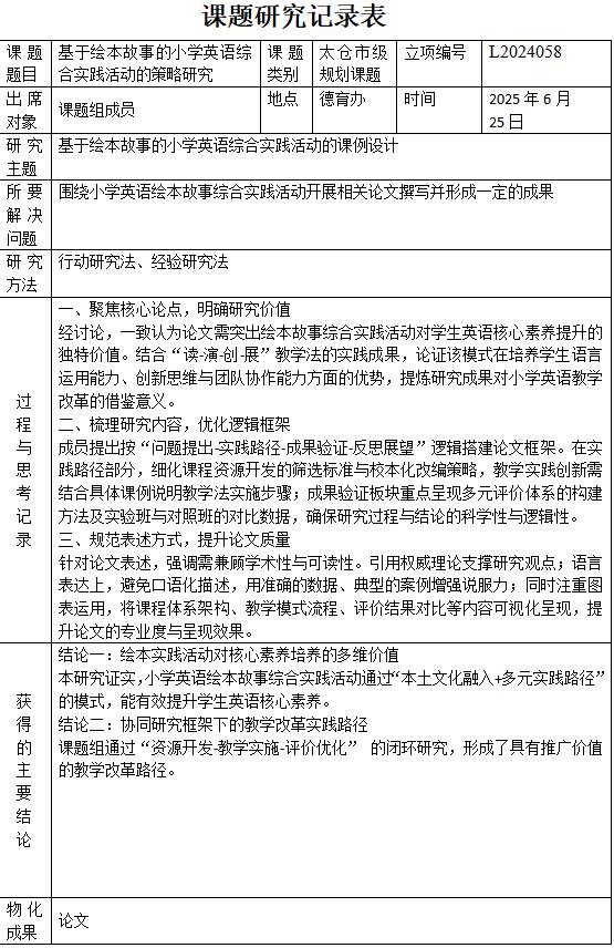 组内教师围绕“小学英语绘本故事综合实践活动”主题开展论文撰写研讨。经讨论,一致认为论文需突出绘本故事综合实践活动对学生英语核心素养提升的独特价值。按“问题提出-实践路径-成果验证-反思展望”逻辑搭建论文框架。针对论文表述,强调需兼顾学术性与可读性等。