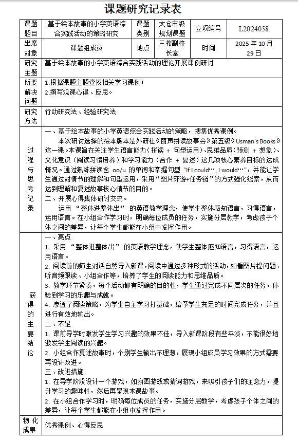 2025年10月29日下午,“基于绘本故事的小学英语综合实践活动的策略研究”课题组开展10月研讨活动。课题组以“核心素养落地”为导向,围绕外研社《丽声拼读故事会》第五级《Usman's Books》开展专题实践活动。