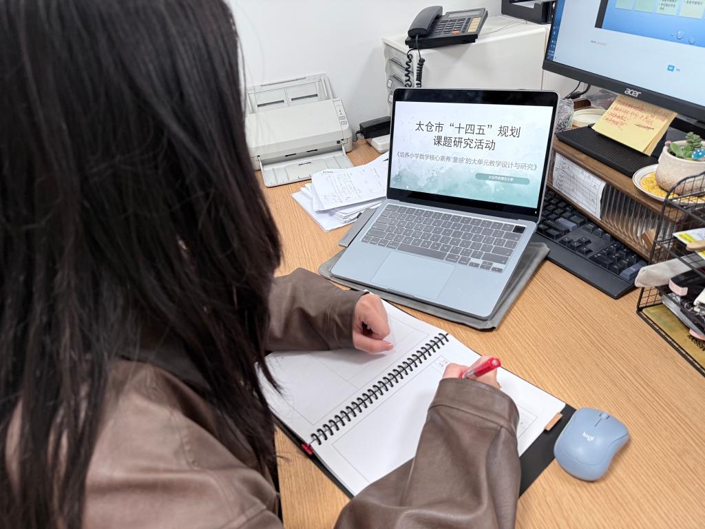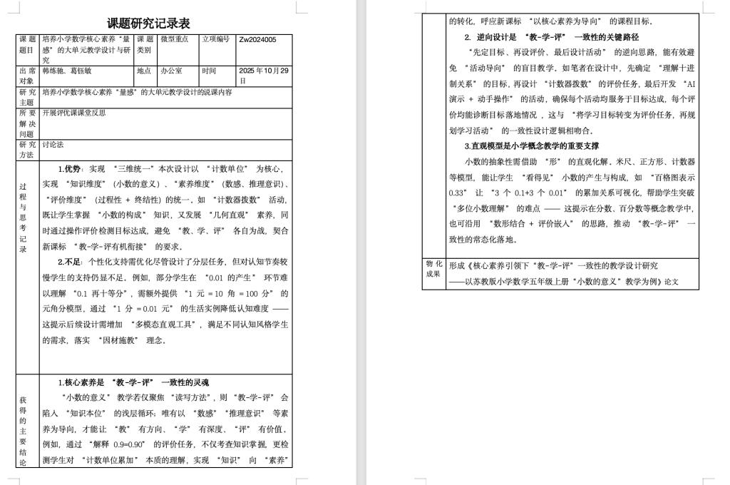 2025 年 10 月 29 日,微型重点课题《培养小学数学核心素养 “量感” 的大单元教学设计与研究》研讨活动在办公室开展。韩练驰、葛钰敏围绕 “量感” 大单元教学设计说课内容,以讨论法反思评优课。