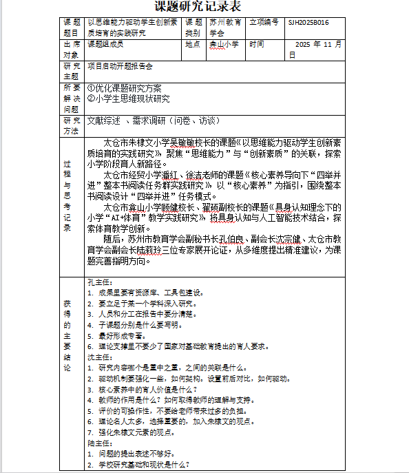 太仓市朱棣文小学吴敏敏校长的课题《以思维能力驱动学生创新素质培育的实践研究》,聚焦“思维能力”与“创新素质”的关联,探索小学阶段育人新路径。
